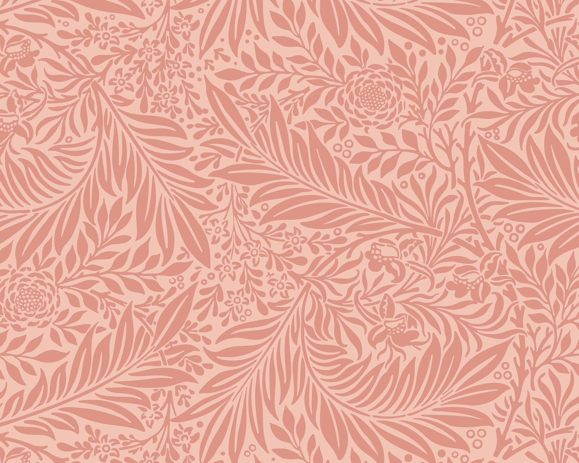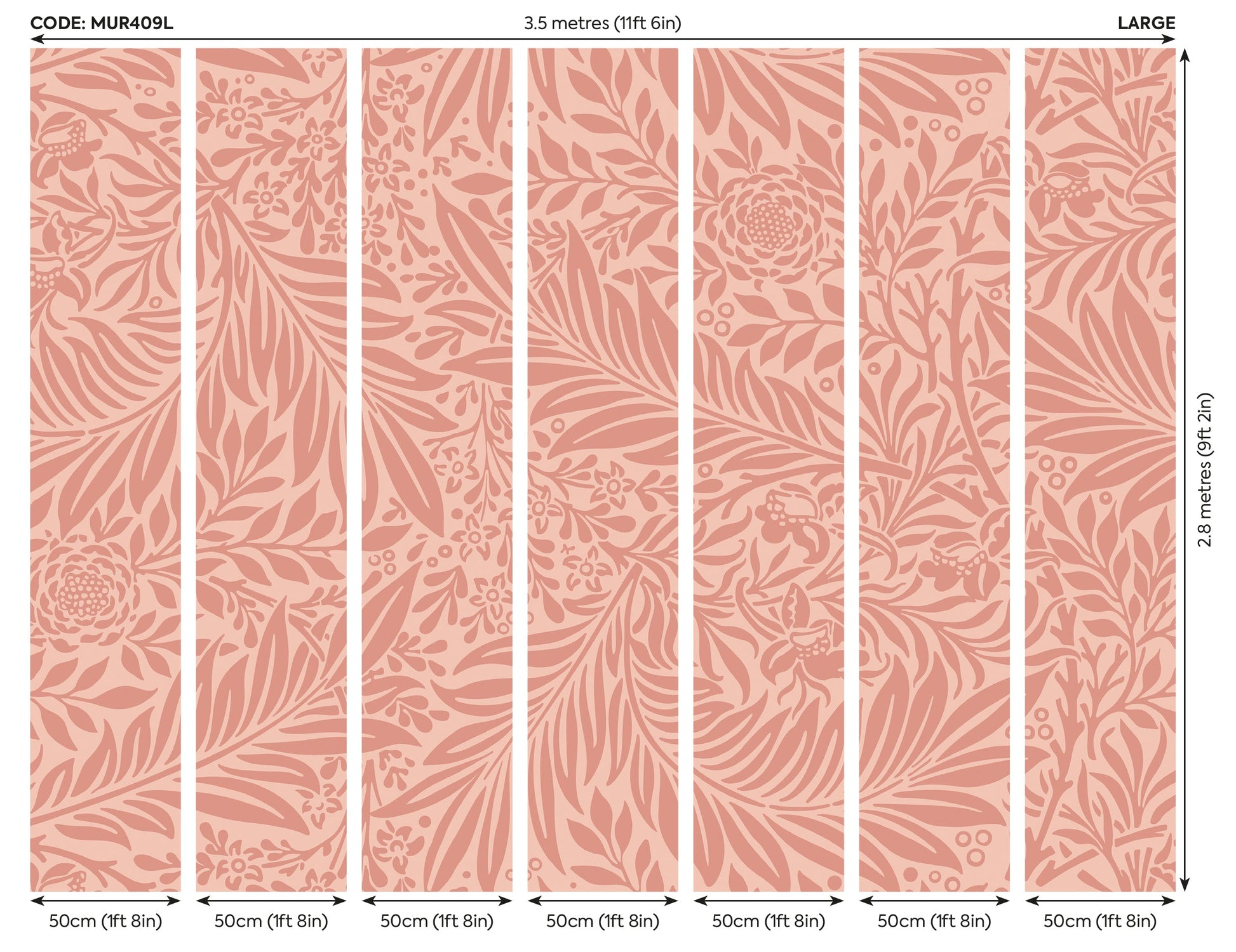 The image showcases a delicate, flowing pattern: soft, floating leaves and graceful ferns cascade across a warming coral backdrop. Dainty flowers and subtle dots intermingle within the design, creating a tranquil and welcoming atmosphere. Gentle hues and an eye for detail make this mural a captivating feature wall, bringing nature-inspired serenity to your home.