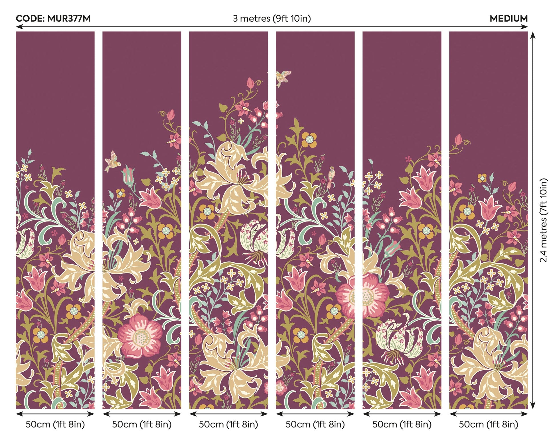 - Stylised lilies and flowing foliage in rich aubergine and lush green tones