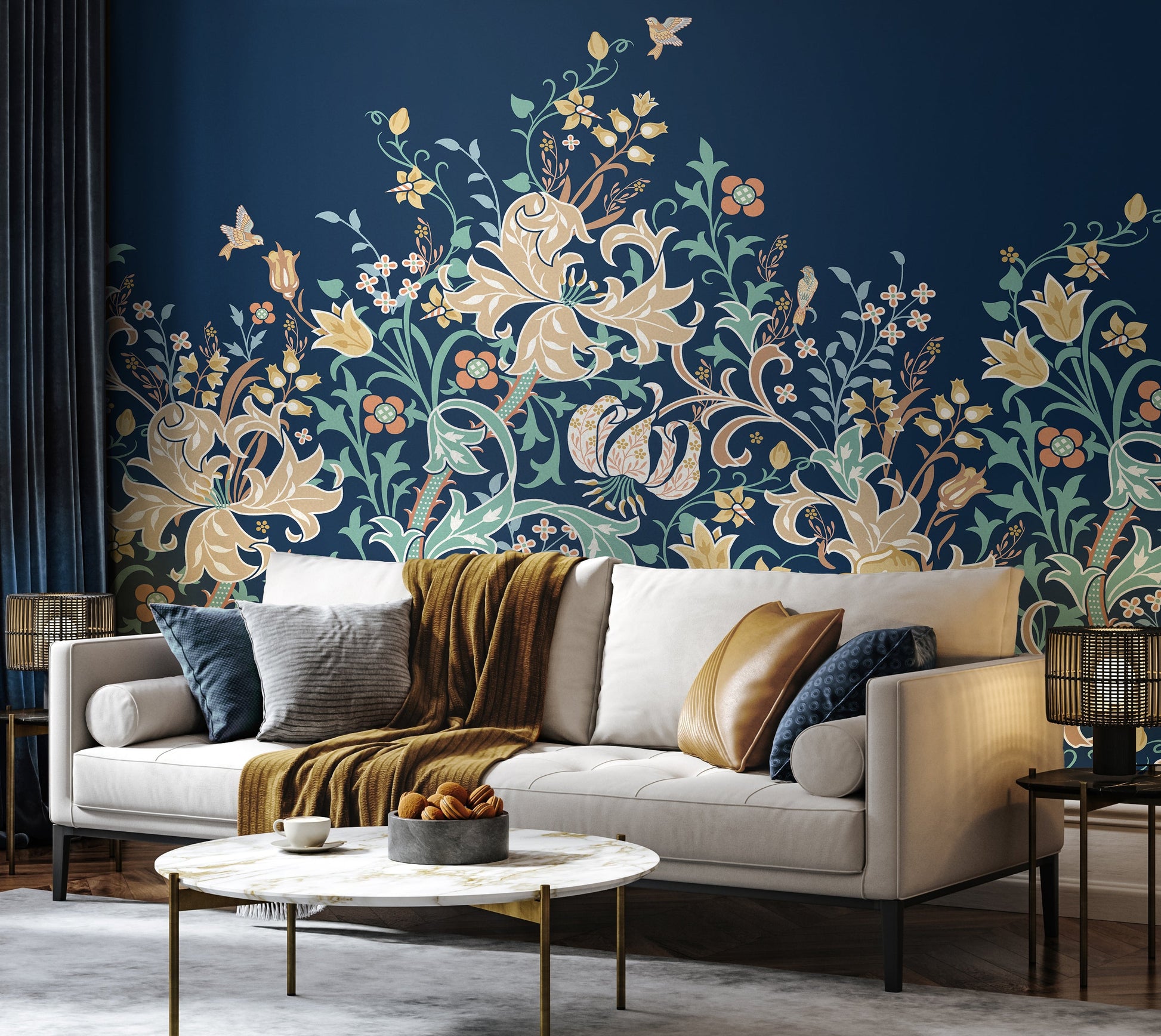 The Origin Murals Trailing Lily Navy Blue wallpaper is a striking example from Origin Murals, inspired by John Dearle’s design for William Morris and reimagined in a colourful and confident manner. This mural invites the sophistication of classic British interiors into your home, seamlessly blending historic motifs with updated styling for modern living spaces.