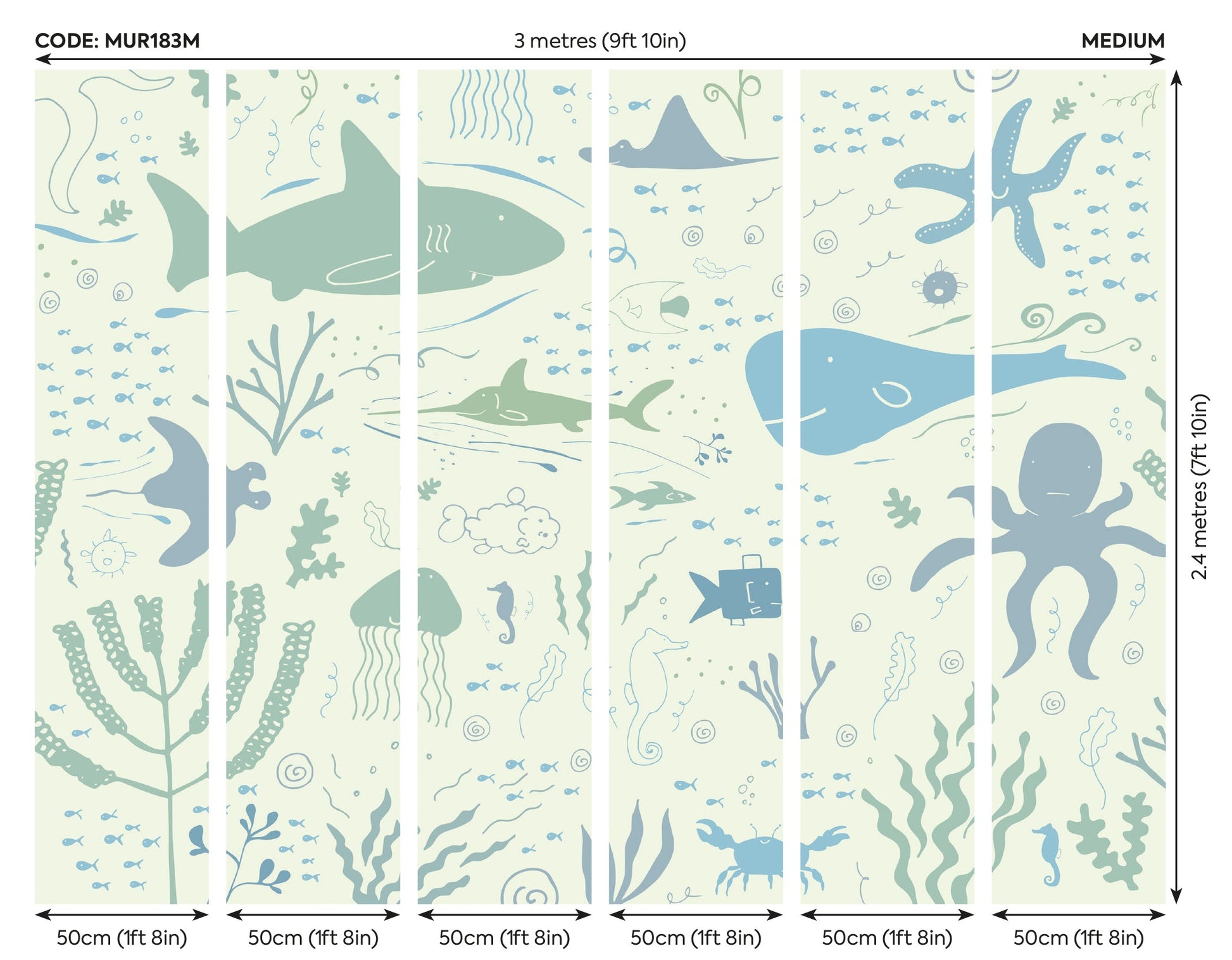 The visual for the Origin Murals Underwater Adventures Seafoam features an enchanting aquatic scene, teeming with colourful sea creatures and delicate marine plants dancing amongst gentle currents. Soft, serene hues evoke a peaceful oceanic world, where curious fish glide amongst coral and bubbles rise towards the surface, inviting a sense of wonder and calm.