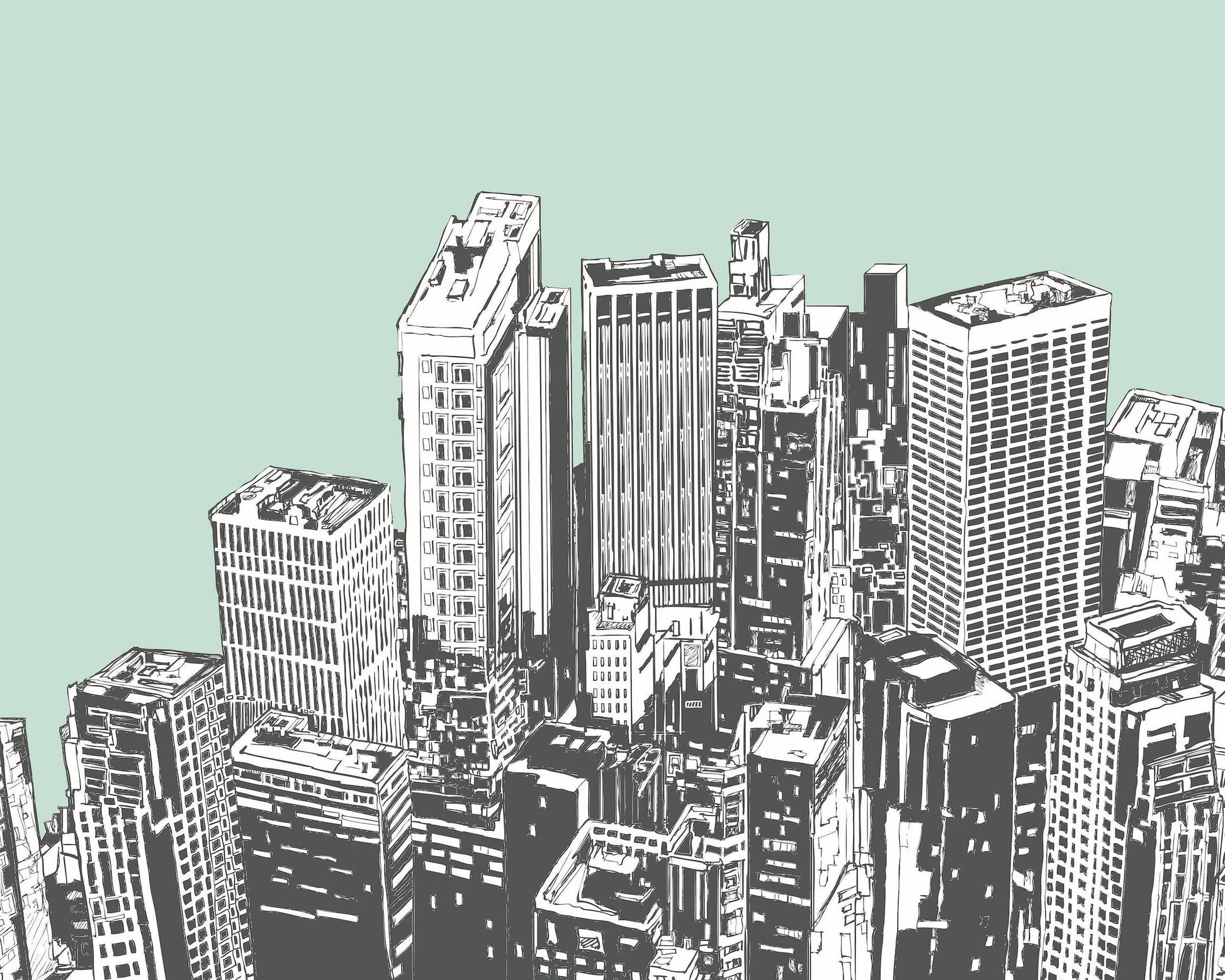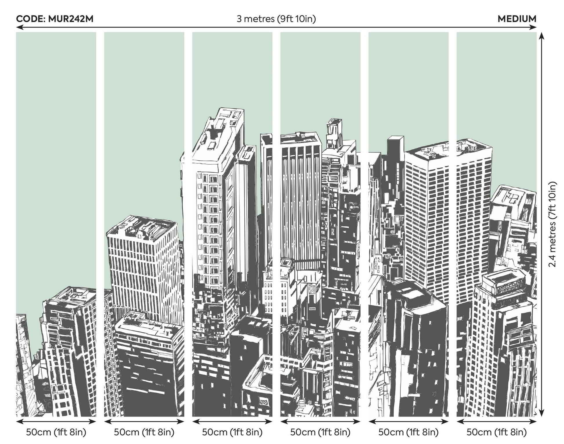 Enhance your home or office with the stylish and immersive Origin Murals Urban City Skyscrapers Mint Green wallpaper. Embrace urban serenity, combining the buzz of city life with the comfort of your own personal retreat.