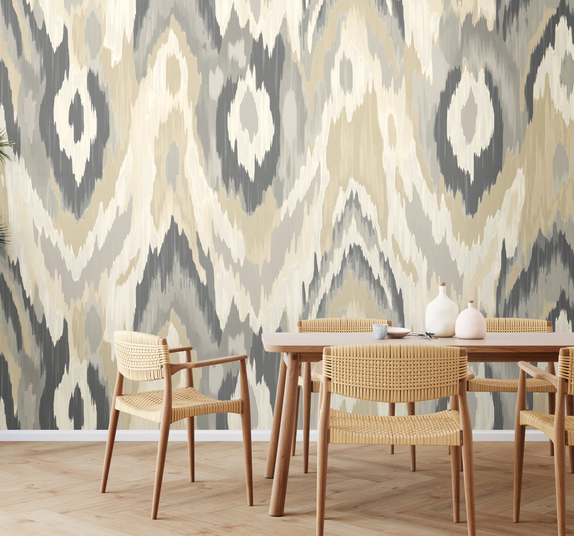 The image features a stunning mural awash with gentle stone and linen hues, artfully arranged through fluid, watercolour brushstrokes. The design showcases an abstract reinterpretation of the traditional Ikat motif, blending layers of soft grey and beige tones to create a tranquil, contemporary canvas for your wall. The painterly strokes gently transition and overlap, lending a sense of movement and depth that can transform any room into a serene retreat.