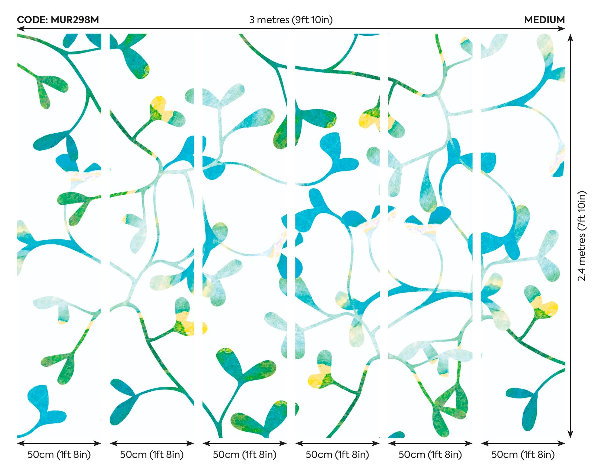The image showcases a dreamy cascade of softly watercoloured petals and graceful stems, gently winding across a serene blue backdrop. The delicate brushwork and fluid movement captured in the design infuse your wall with a sense of peaceful artistry and effortless sophistication. This mural evokes the refreshing tranquillity of a spring morning, with gentle blue tones and painterly floral forms adding a bright and whimsical accent to your home.