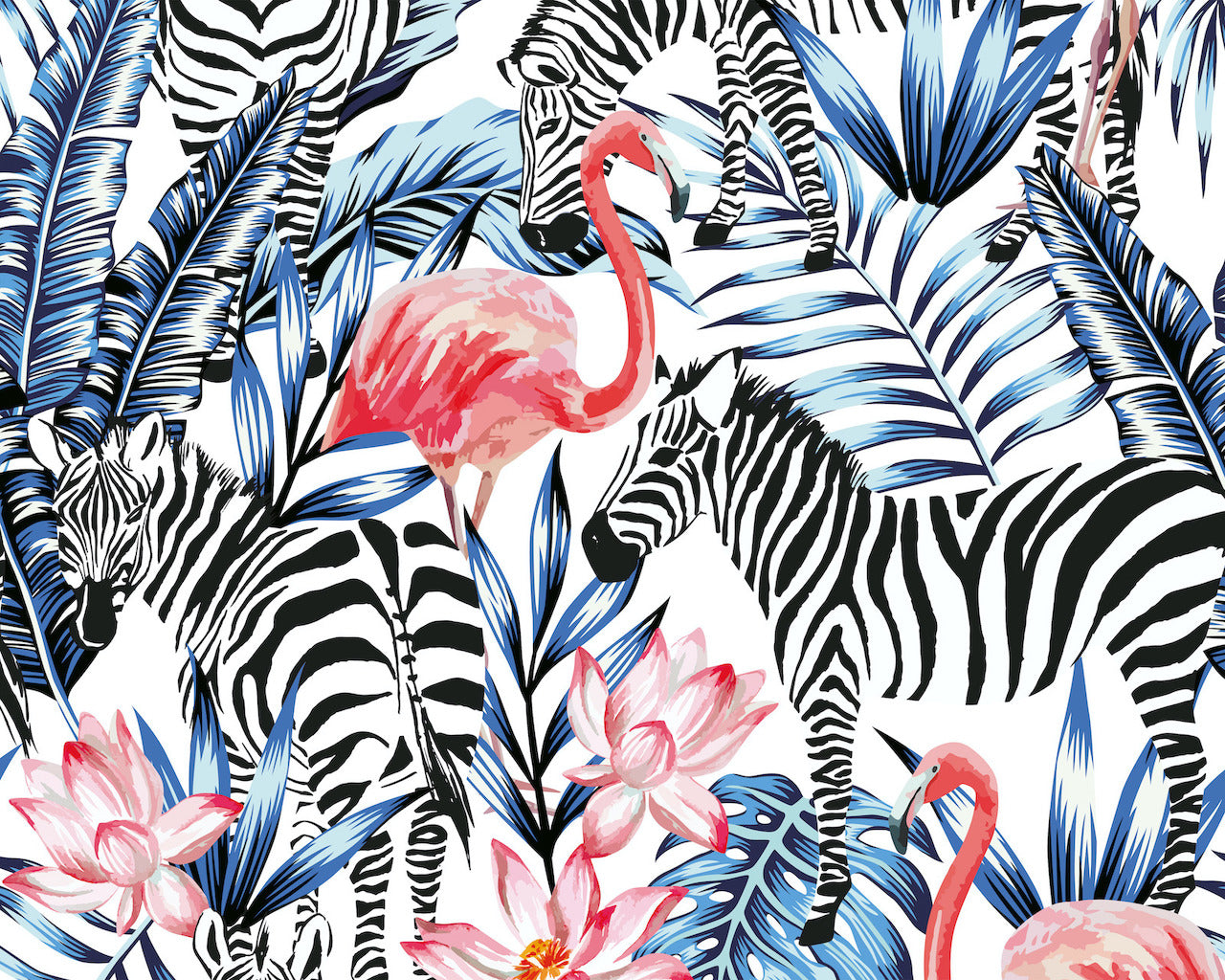 The image presents an exuberant wilderness, where magnificent palm leaves arch gracefully above bold splashes of exotic blossoms. Amidst this lush canopy, striking zebras and elegant flamingos appear, their lifelike detail and vivid poses bringing a sense of movement and intrigue to the scene. The combination of deep cobalt and vibrant coral tones ensures this mural will create a lively, privileged hub within your space.