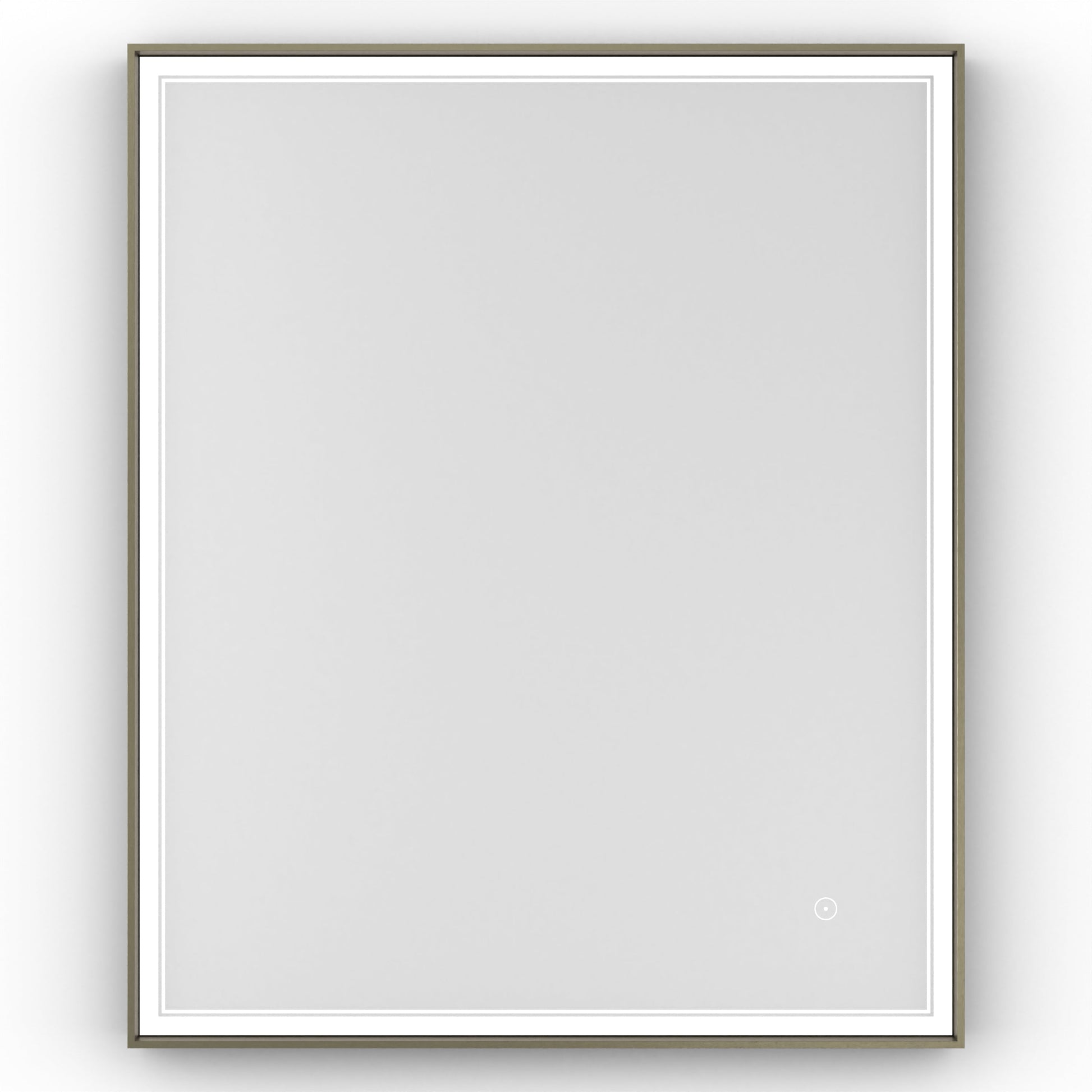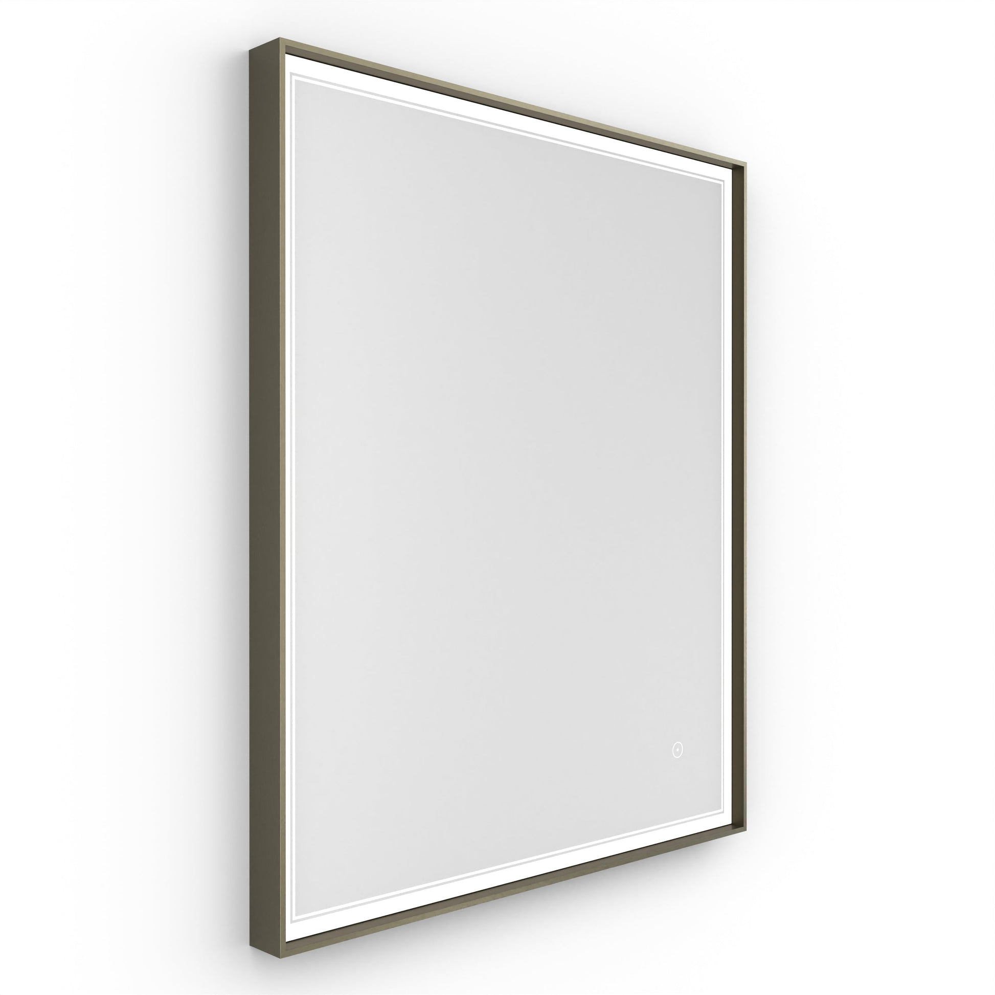 The image beautifully showcases a striking rectangular mirror bordered by a sleek brushed bronze aluminium frame. Soft, double illuminated lines encircle the mirror, casting a gentle, ambient glow that highlights the piece’s chic, minimalist design. The surface gleams with absolute clarity, exuding both elegance and practicality in equal measure.