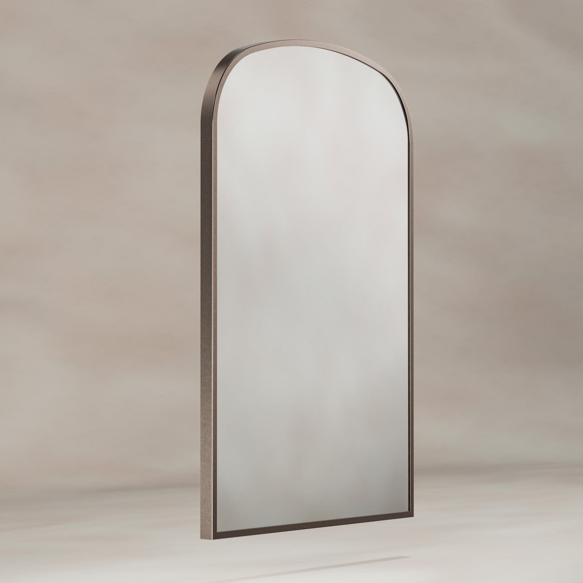 The image displays a stunning arched mirror with a gently curved top that creates an inviting focal point. Its brushed bronze finish gleams softly in the light, giving the piece a rich, warm presence. The understated frame exudes modern sophistication, perfect for adding a touch of luxury to any setting without appearing gaudy or overwhelming.