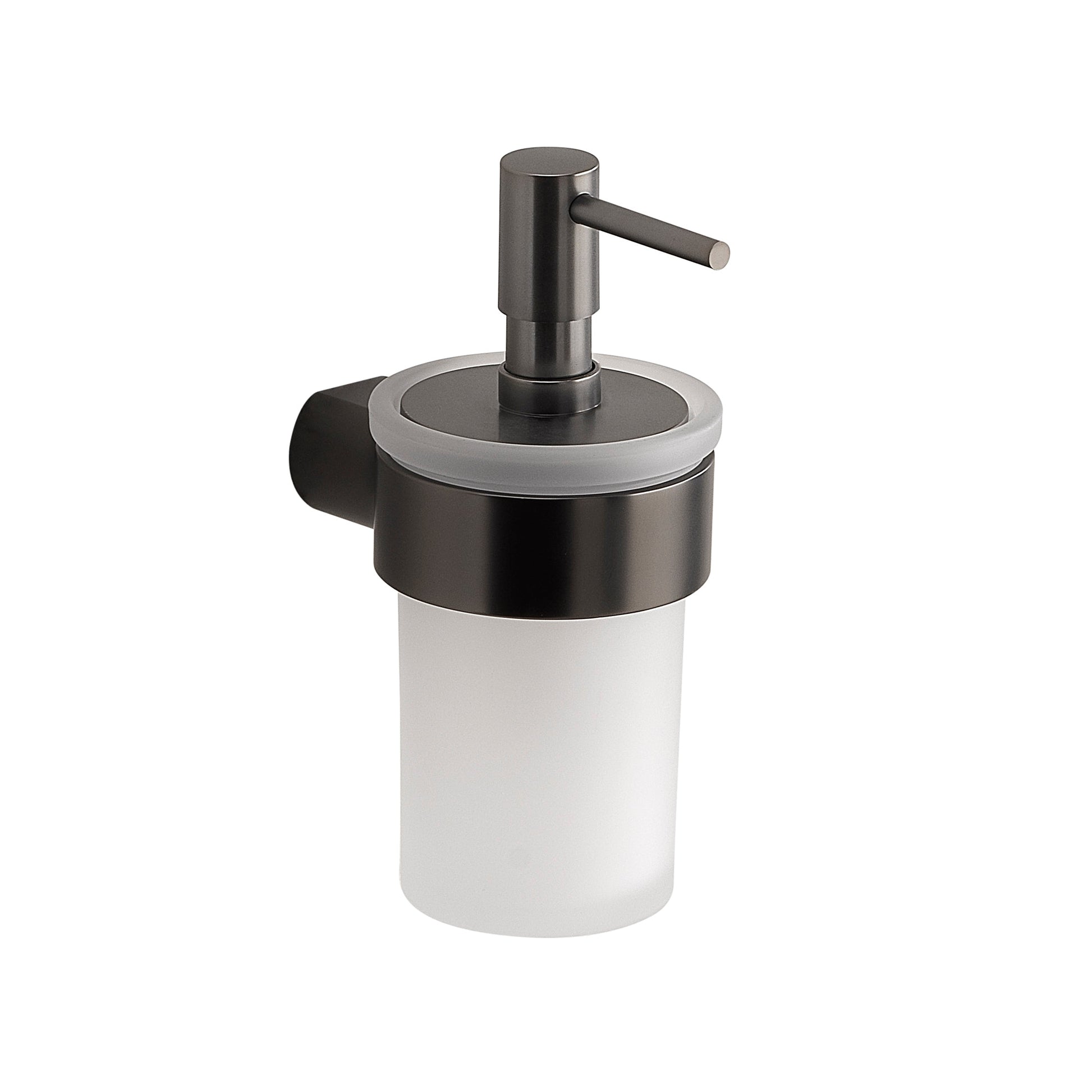 In the product image, the soap dispenser boasts a striking gunmetal tone, delivering a contemporary yet timeless appeal. The dispenser features clean lines and a robust structure, enhanced by a subtly frosted glass holder that complements the sleek finish. Its minimalist silhouette sits elegantly against bathroom surfaces, radiating refinement and modern luxury without overwhelming the space.
