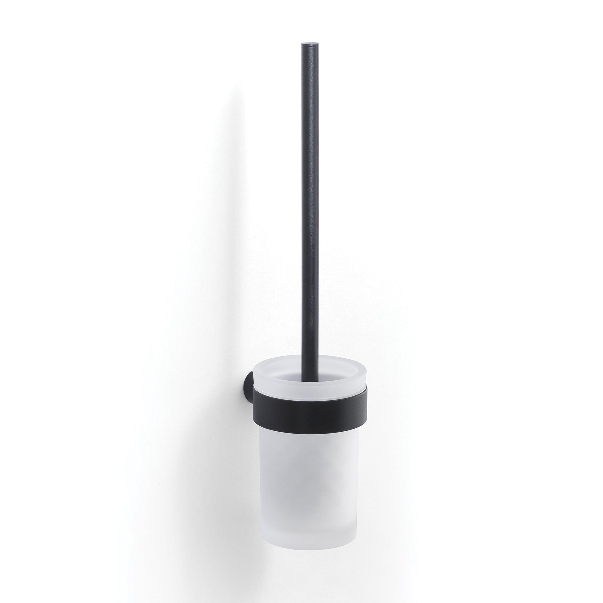 The product image presents a sophisticated bathroom accessory, with the brush and holder neatly affixed to the wall. The matte black hue provides a bold yet refined statement, while the frosted glass delicately diffuses light, adding a touch of understated luxury. Concealed fixings ensure a seamless, uncluttered appearance, highlighting the set’s meticulous attention to detail and clean, minimalist design.
