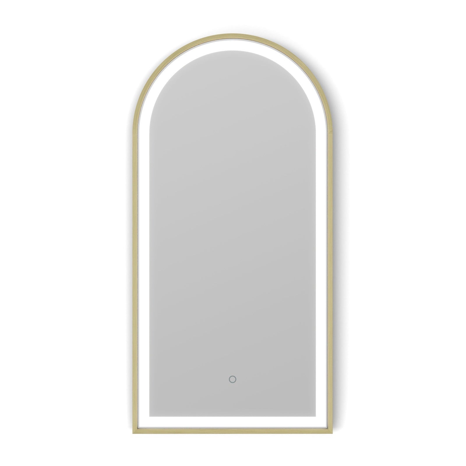 The image showcases a gracefully arched mirror with a warm brushed brass finish, radiating sophisticated charm. The gentle illumination emanates from within the glass, casting even daylight-white lighting around the frame. The oversized arch design delivers modern elegance, making a striking statement in any contemporary bathroom or cloakroom.