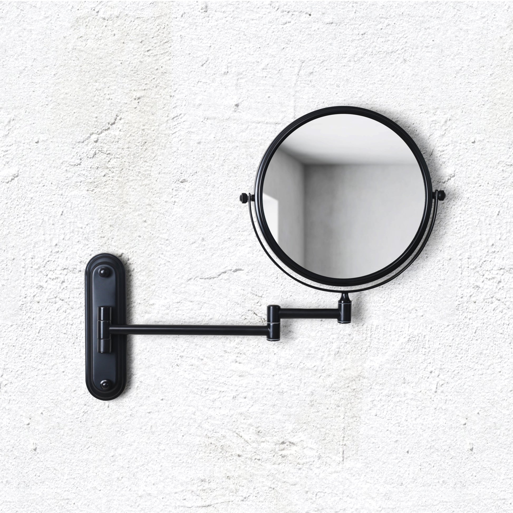 In the image, the mirror displays a sleek, circular silhouette with a refined matt black finish that enhances its stylish and understated look. The frame is minimalistic, featuring smooth contours and a reversible design that seamlessly blends into both modern and classic interiors. The extending arm allows flexible placement, ensuring the mirror remains both practical and visually appealing when mounted.