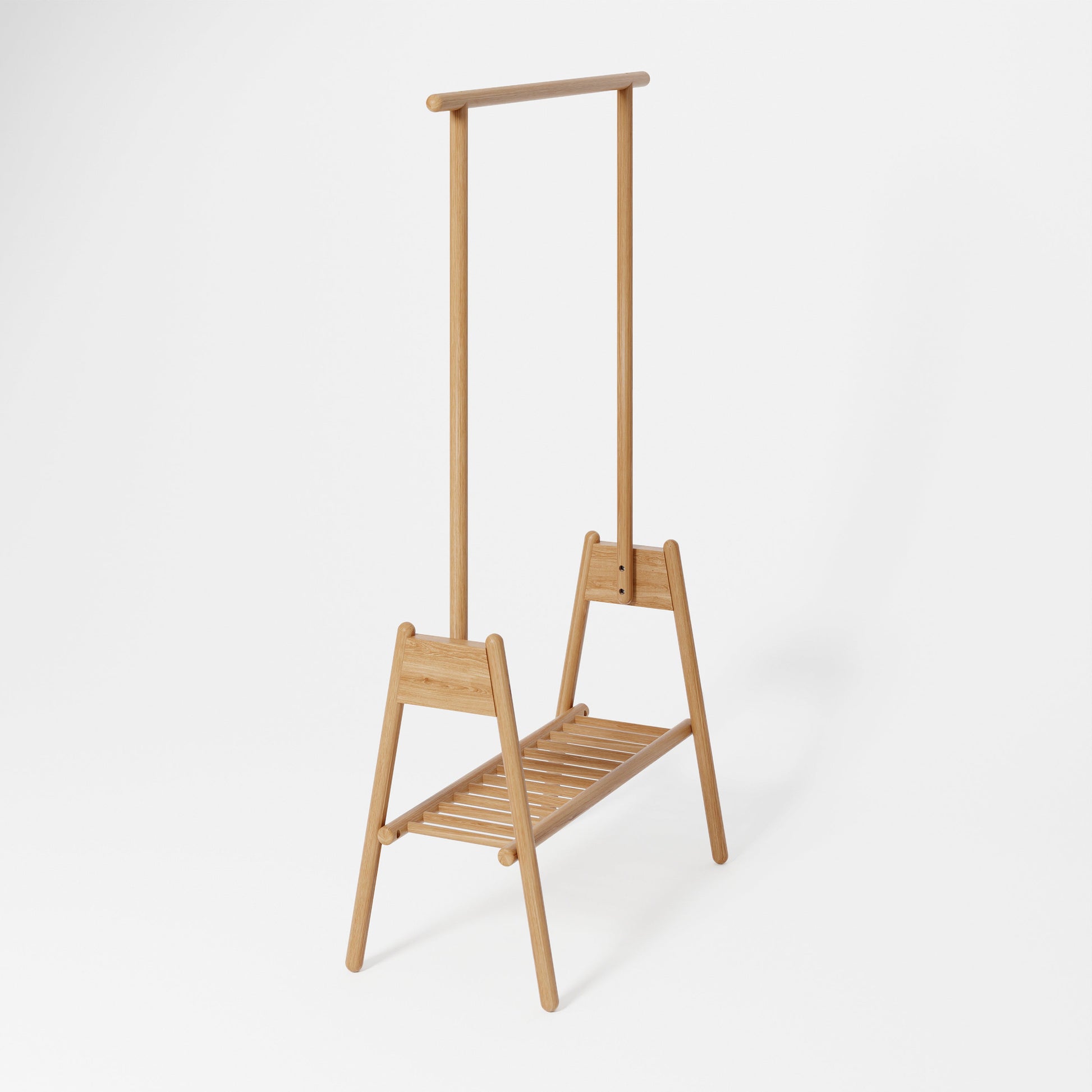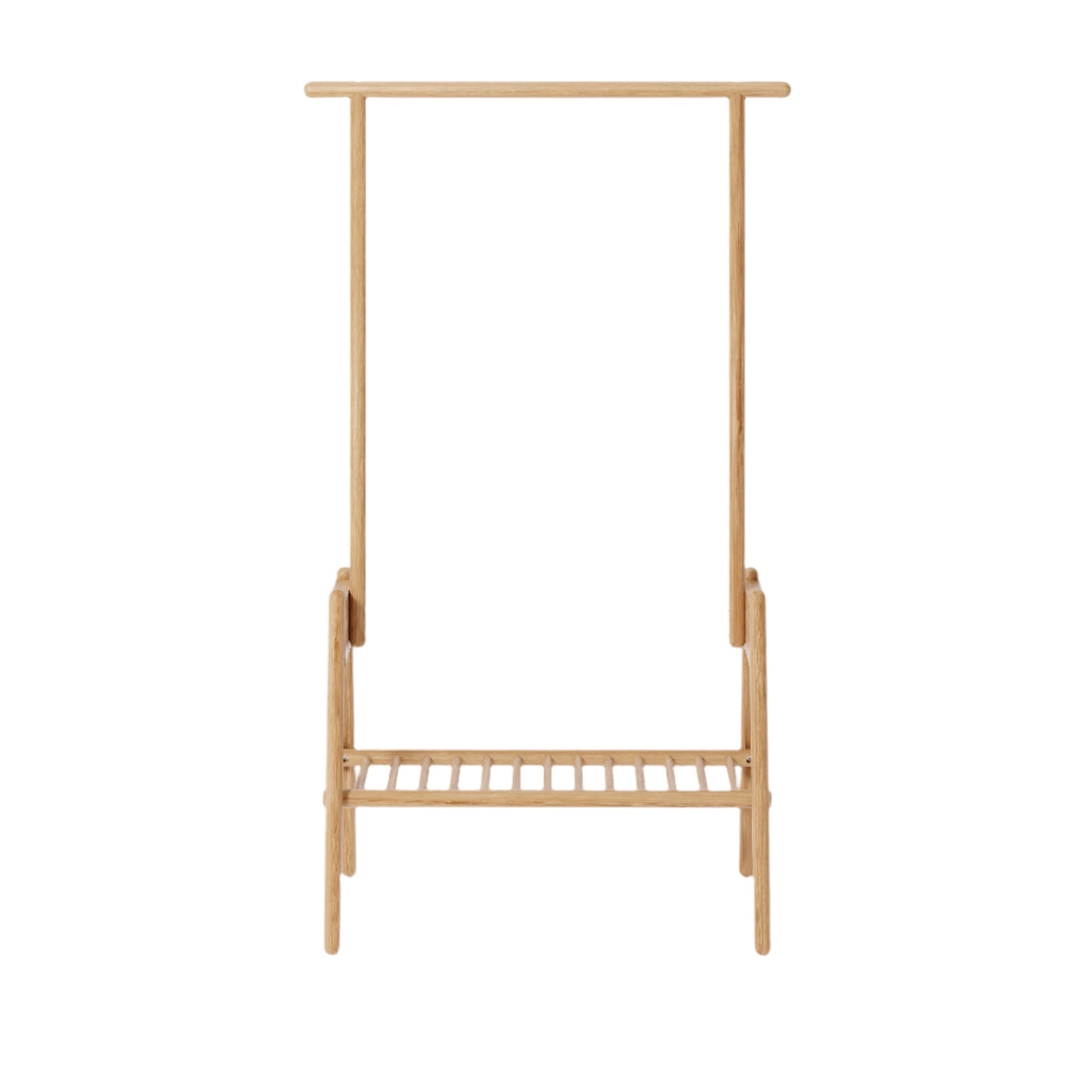 The Wireworks Clothes Rail Hang Up Oak is from a well-known brand, renowned for designer flair and exceptional high quality. The image showcases a beautifully crafted clothes rail featuring a natural oak finish with a subtle matt sheen. Its clean lines and sturdy construction lend both sophistication and utility, while the lower slatted shelf provides an inviting space for displaying shoes or folded garments, with an open, airy look.